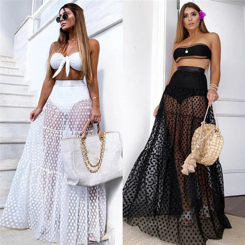 Layer this chic see-through maxi skirt over your favorite bikini or one-piece swimsuit for a glamorous beach look, or pair it with a cropped tank and sandals for an effortless summer outfit.