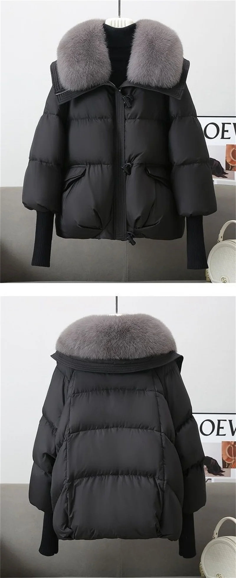 Neckline: Oversized wool collar adds cozy elegance and extra insulation